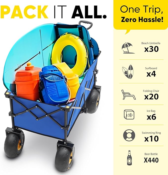 Make beach days effortless with our heavy-duty beach wagon with sand wheels.
